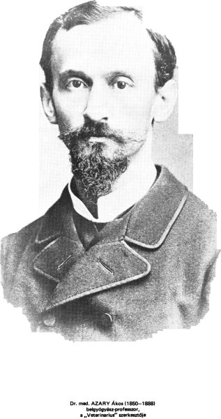 Azary Ákos (1850-1888), orvos-sebészdoktor, 1874-ben kapott orvosdoktori oklevelet. A boszniai hadjáratban közös-hadseregbeli főorvosként vett részt. Tehetségére Tormay Béla és Thanhoffer Lajos figyelt fel.1881-ben állami állatorvosnak nevezték ki, az Állatorvosi Tanintézetben a belgyógyászatot oktatta. Zlamál Vilmos visszavonulása után a Belgyógyászati Tanszék vezetője (1882-1888) és az állatjárványtan valamint az állategészségügyi rendészet magántanára (1886-1887). Azary alkalmazta először következetesen a belgyógyászati fizikai vizsgálatokat és modern bakteriológiai gondolkodás jellemezte. A veszettség elleni védőoltásokat már akkor szép sikerrel végezte, amikor arra Európában még a franciákon kívül senki sem gondolt. 1885-ben részletes javaslatot dolgozott ki intézményünk újjászervezésére, Hutÿra későbbi reformterveinek az Azary-féle koncepció volt az alapja.