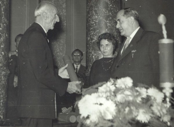 Kotlán Sándor átveszi a h. c. doktori oklevelet Sályi Gyula rektortól a Magyar Tudományos Akadémián rendezett jubileumi ünnepségen.