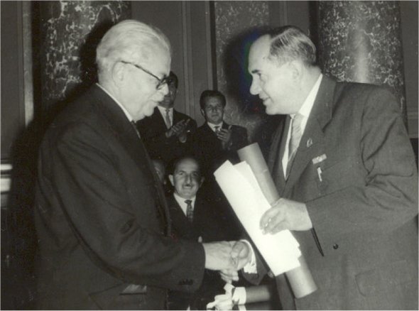 Mócsy János átveszi a h. c. doktori oklevelet Sályi Gyula rektortól a Magyar Tudományos Akadémián rendezett jubileumi ünnepségen.