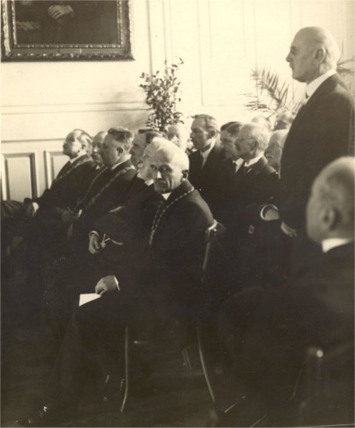 Zimmermann Ágoston felszólalása a Hutÿra Ferenc tanárságának 40. évfordulóján rednezett ünnepségen 1929. január 20-án Zimmermann Ágoston szólal fel. Az első sorban, a sorszéltől a fal felé: Szily K., Preisz Hugó, Pogány Béla, Verebély Tibor, Kéthly L., Doby Géza. A második sorban a sorszéltől a fal felé: Zimmermann Ágoston (áll), Tauffer Vilmos, tőle a második Rhorer László, majd Wellmann Oszkár, Berrár Mihály. |