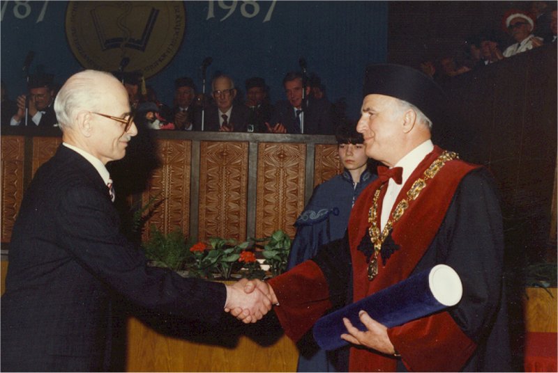 akadémikus átveszi a h. c. doktori oklevelet Kovács Ferenc rektortól.